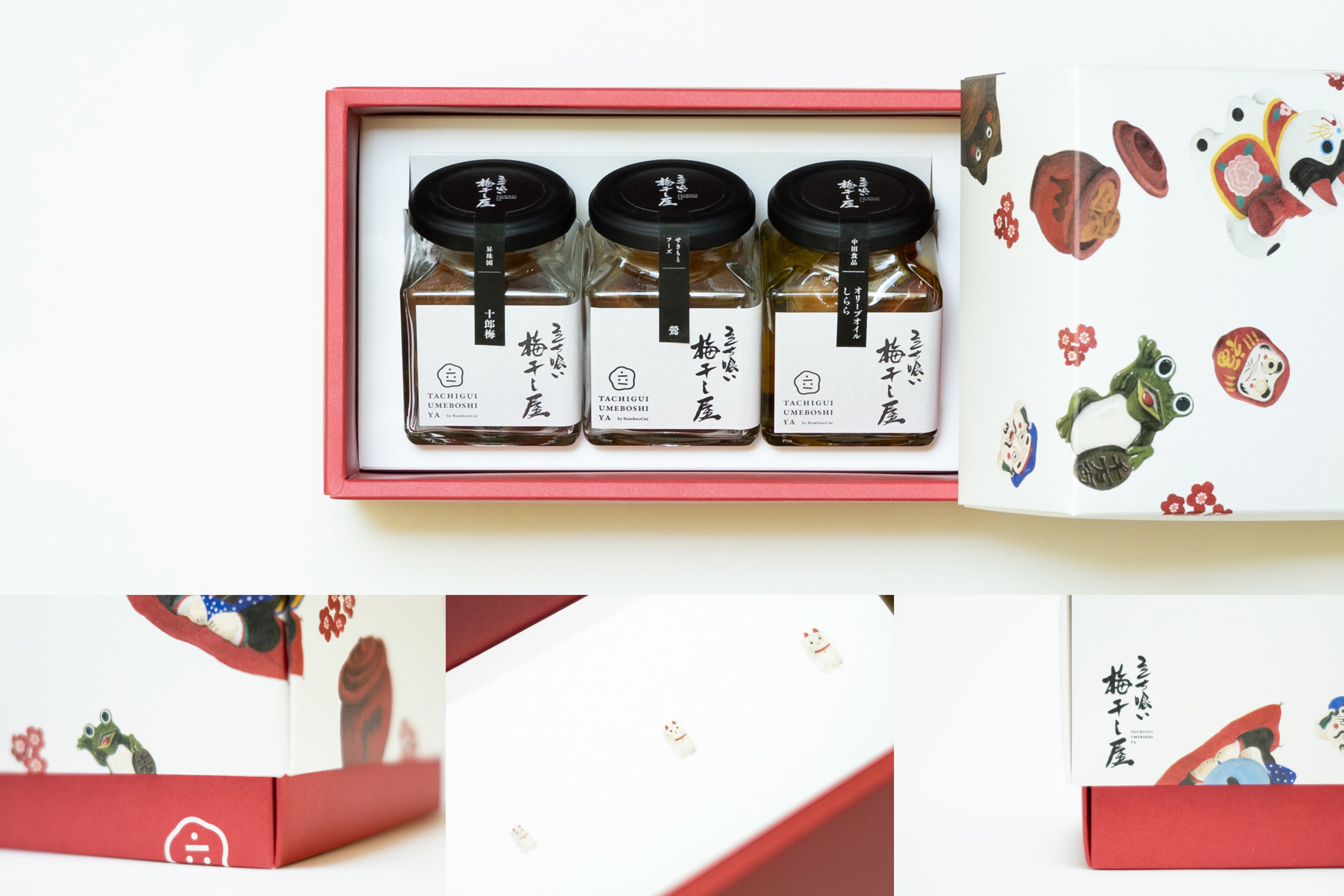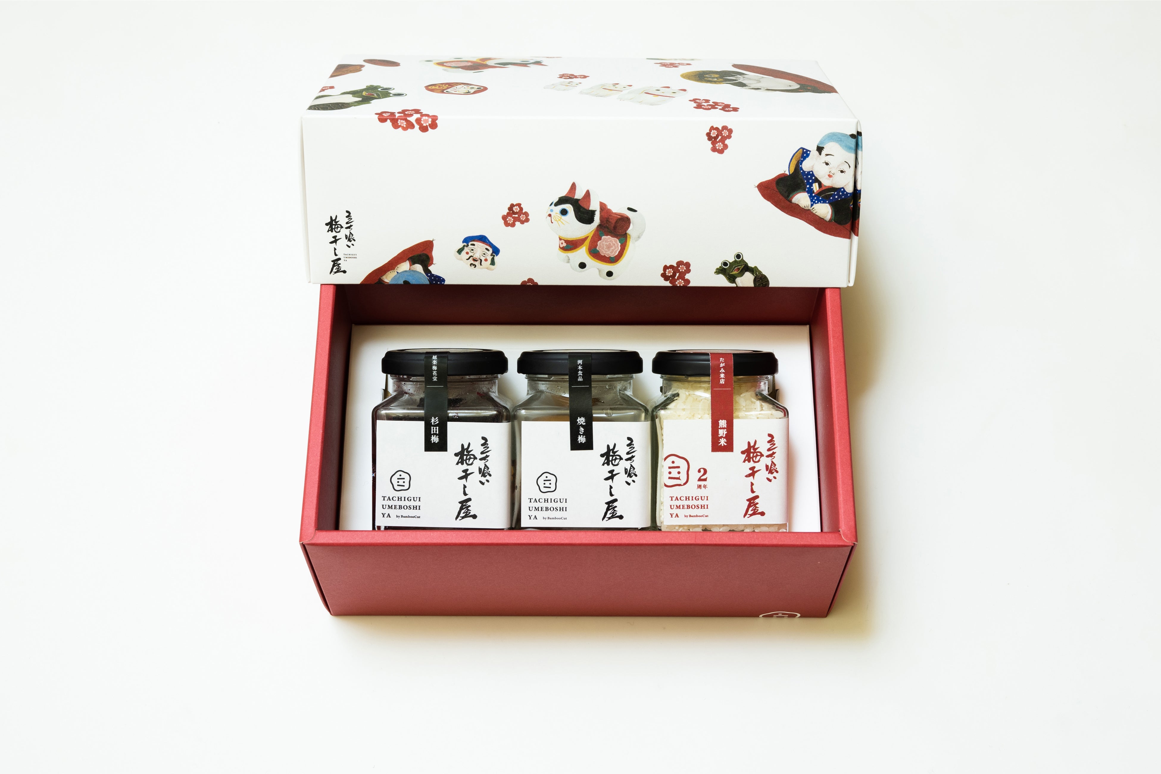 立ち喰い梅干し屋のお土産としてご好評をいただいている16種類の梅干しを小瓶に詰めた「まかない瓶」。 二周年を記念して、お好きなまかない瓶を「3瓶」詰められる、新たな専用ギフトボックスが登場しました!