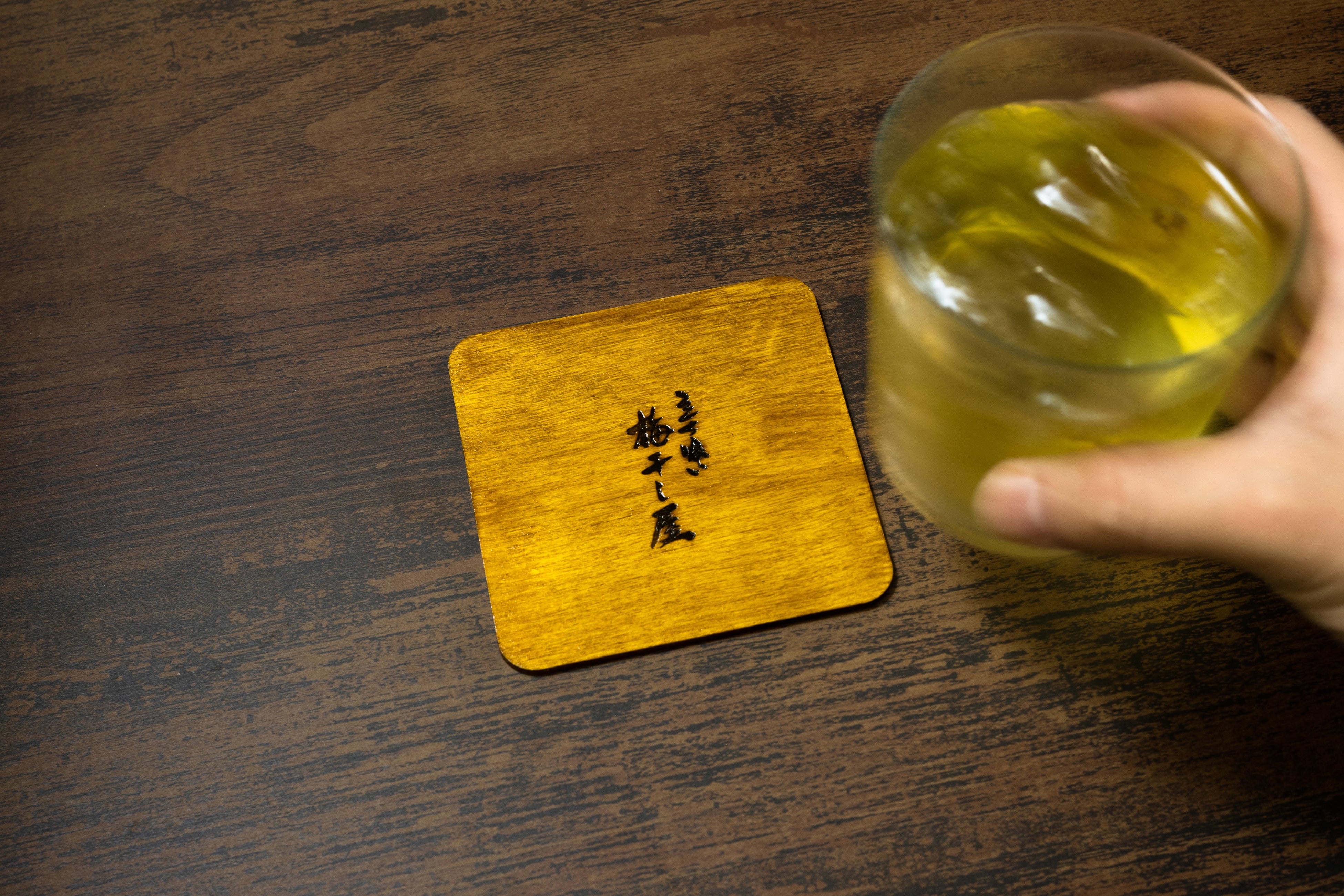 立ち喰い梅干し屋の焼印が入った、当店オリジナルのコースターです。湯呑みやグラスがよく似合う、梅干しともよく似合う⁉︎ 店頭でも使用しているコースターです。3月19日(土)の開店時からカウンターで梅干しを食べていただいたお客様【先着222名様】にプレゼント!