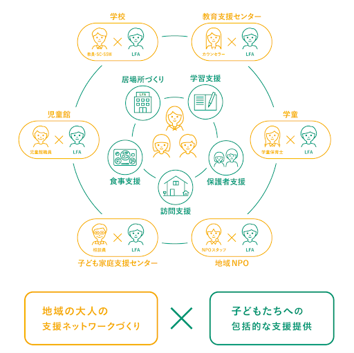 LFAは2014年の活動開始から困難を抱える子どもや家庭に向き合う中で、既存の子ども支援政策やいちNPOの支援だけでは子どものニーズを質量ともに満たすことが難しいと考えてきました。そこでLFAがモデルづくりを進めてきた「地域協働型子ども包括支援(下記参照)」のノウハウをもとに、全国で子ども支援に関わる団体の活動を資金と研修や伴走支援などの非資金的でも応援・推進したいと思い、ゴールドマン・サックス様、パブリックリソース財団様のご協力を得て、2021年5月に「ゴールドマン・サックス地域協働型子ども包括支援基金(以下、本基金)」を発足しました。