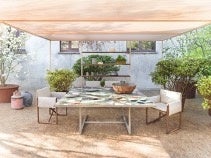 ここではPaola Lenti のインドア及びアウトドアの代表的なコレクションがワンフロアで展開されています。壁と床に選ばれたホワイトとベージュのニュートラルな色合いは、Paola Lenti の大胆な色彩の表現を引き立てています。溶岩石とガラスでできた「Sciara」テーブルのグリーンとターコイズ、