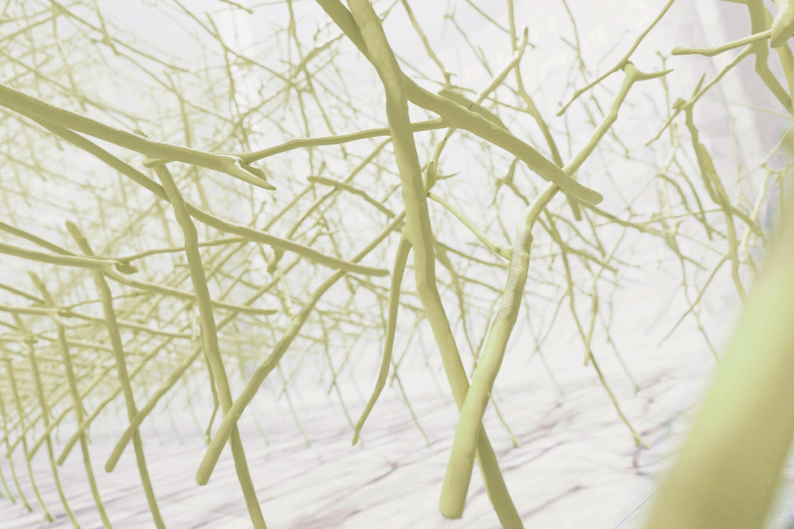 松田優と谷雄一郎によるデザインスタジオ「UO」が、2022年8月10日AM10:48に、表参道ヒルズ前の歩道の植込み(35°39‘59.6“N 139°42’35.6”E)で拾った枝を、2000本に複製し連結したアート作品。無限の空間のほんの一点と、刻々と変化し続ける時間の一点との唯一性を極大化しているこのオブジェクトが、表参道ヒルズの本館 吹抜け大階段に出現する。