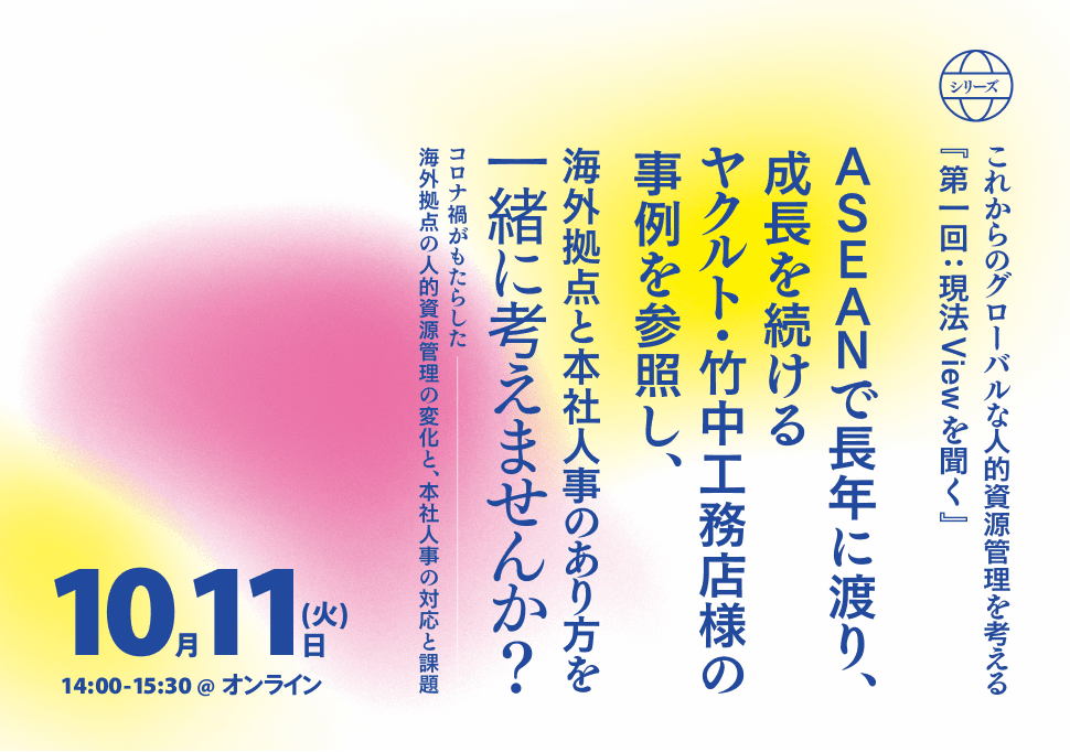 本年度は全3回の開催予定であり、10月11日(火)の第一回は『現法Viewを聞く』と題し、ASEANで長年にわたり成長し続ける、ヤクルト様、竹中工務店様の海外拠点からゲストをお招きします。