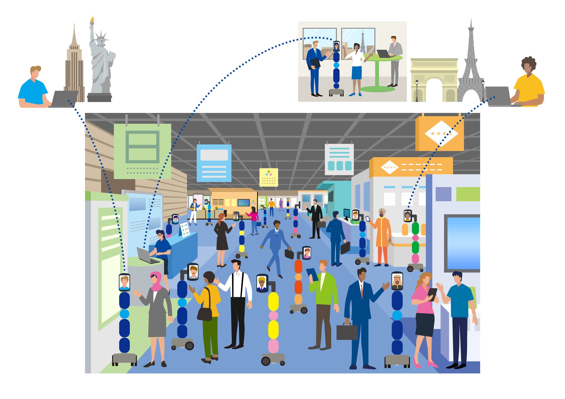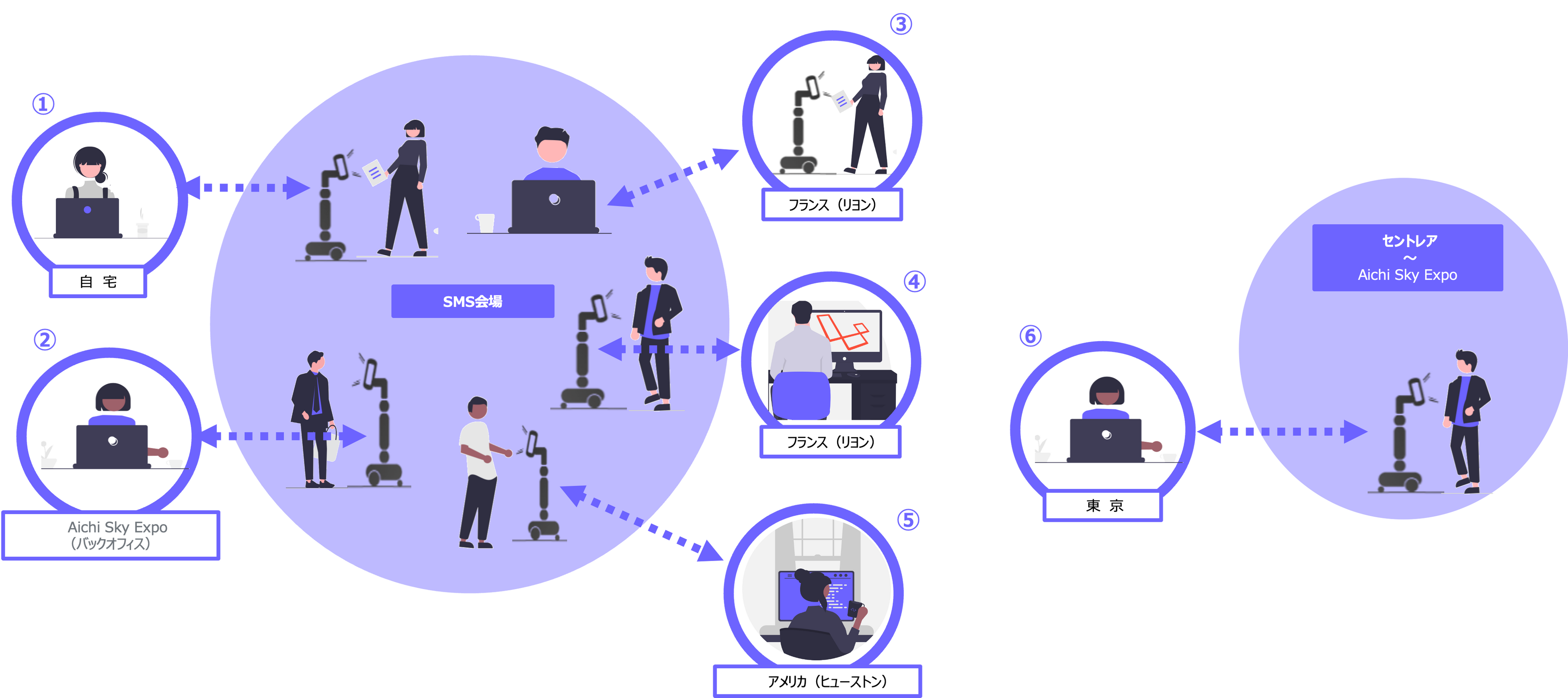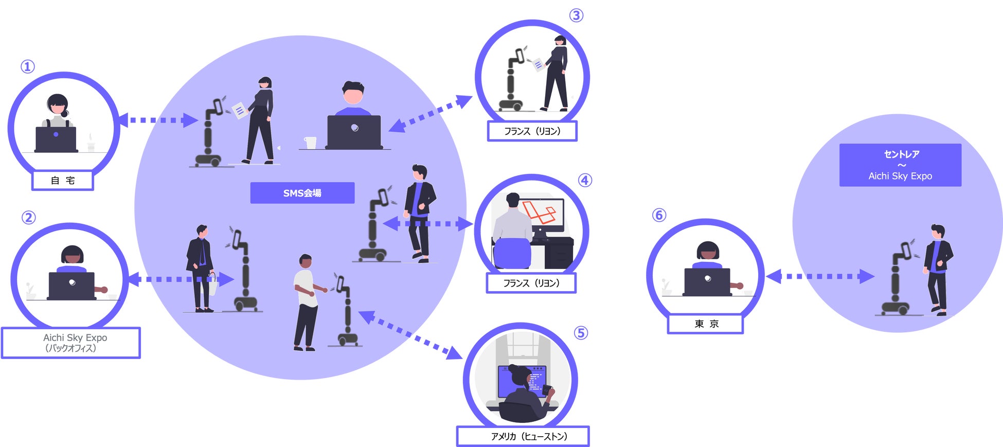 フランスやアメリカから遠隔で愛知県のSMS会場に設置したnewmeを操作してSMSに参加します。これにより、国際的なイベントにおいて手軽に世界中からの参加を可能にし、イベント集客やビジネスチャンスの拡大へとつなげます。
