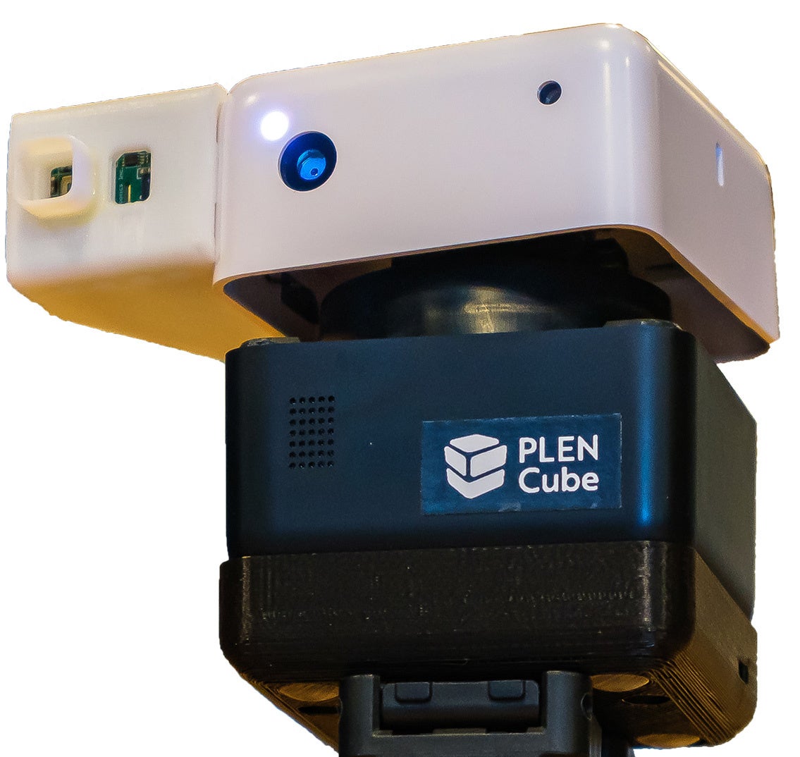 PLEN Cubeは7.4cmの立方体端末内にデジタルビデオ・カメラと顔認識、顔認証、音声認識、会話合成機能を搭載し、入退室管理や商品レコメンド、健康チェックなどを行います。クラウドを介さず端末内で人工知能処理を行うため、通信に伴う遅延が少なく、顔認証の定額使い放題等を実現しました。
