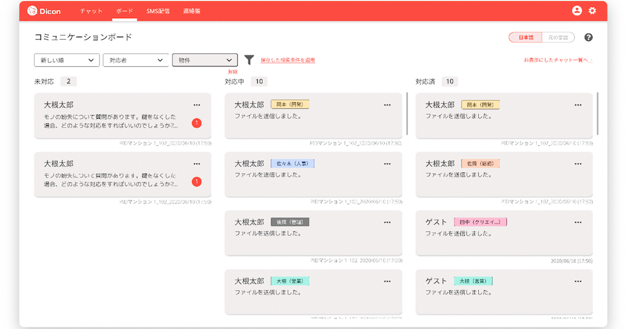 Diconは、コミュニケーションコストを削減する、アプリ不要の多言語コミュニケーションツールです。顧客とのコミュニケーション強化に有効なチャット機能とSMSは自動翻訳機能により多言語に対応しており、一括通知から個別通知まで言語に囚われずコミュニケーションが可能です。