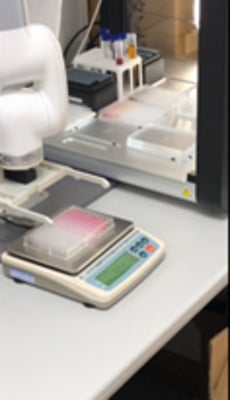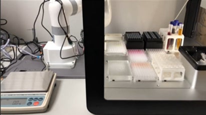 実装された工程は、96穴マイクロタイタープレートにミキシングを含める段階希釈を行い、ロボットアームで希釈後のプレートに蓋を乗せ、OT-2から取り出した後、電子天秤へ搬送して秤量するところまでを一連の行程としました。