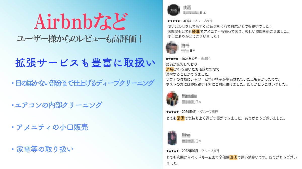 事業内容:民泊・宿泊施設専門の清掃代行、運営支援