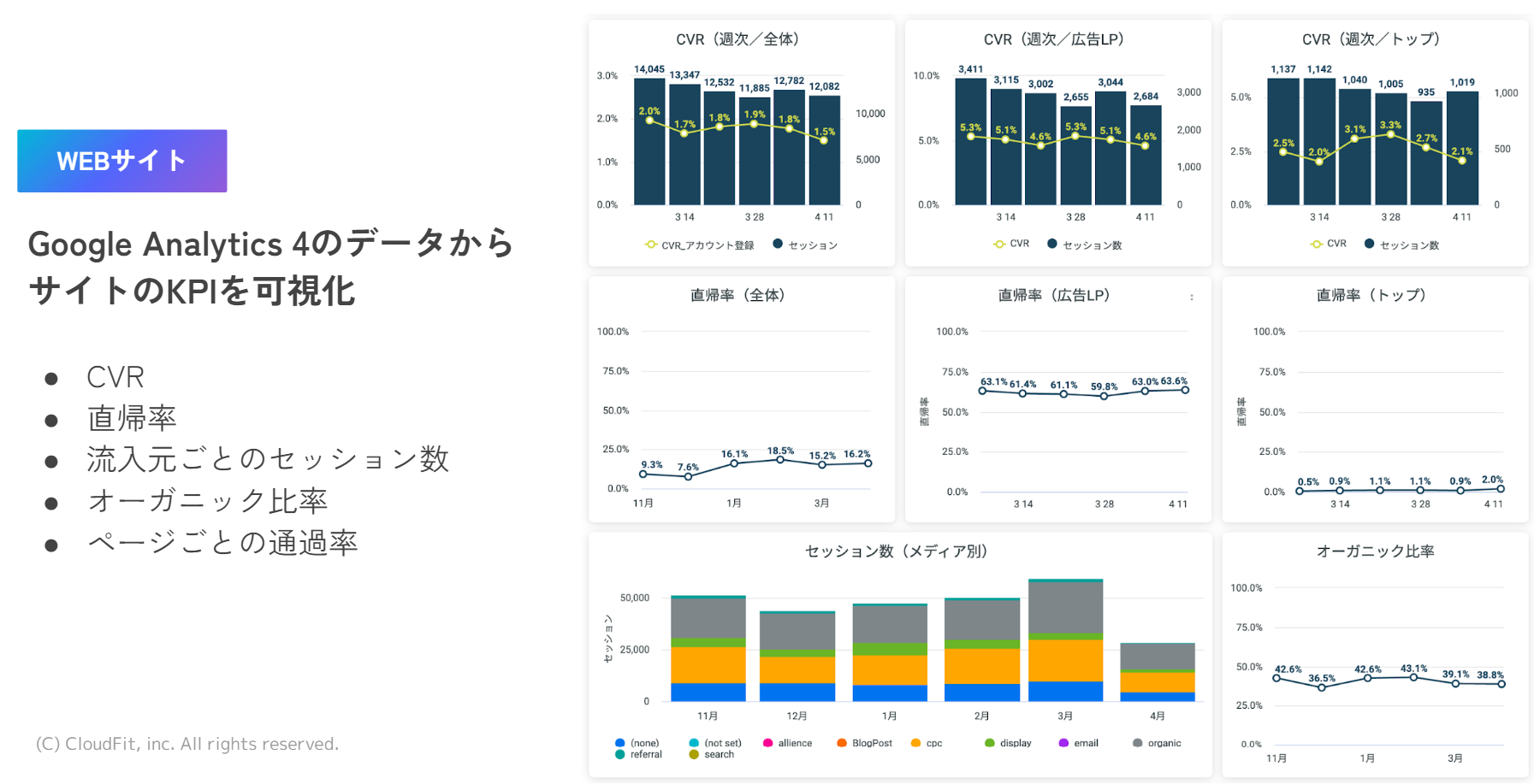 また、CloudFitが提供する豊富なテンプレートから自社のビジネスに最適なレポートを選択して利用することで、即座にビジネス指標の管理を開始できます。また、テンプレートで作成されたレポートに、自社独自のビジネス指標を加えることも可能です。