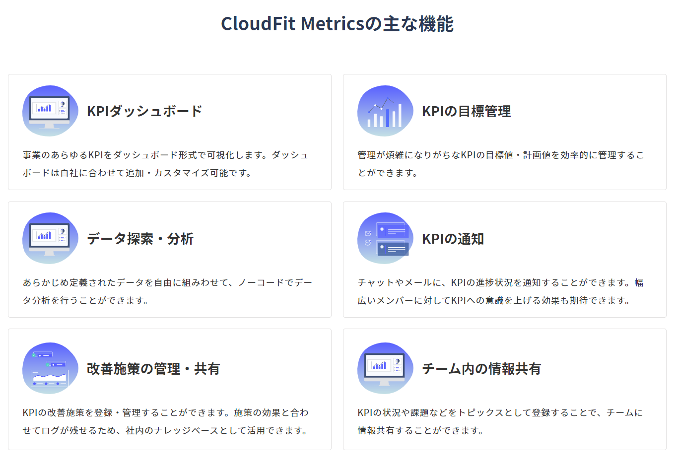 多様な業界・業種を支援することで培ってきた事業分析のノウハウやデータ分析技術を活かし、上記の課題を解決することで、多くの企業がデジタルな経営管理を行える環境をつくるべくCloudFit Metricsを開発しました。