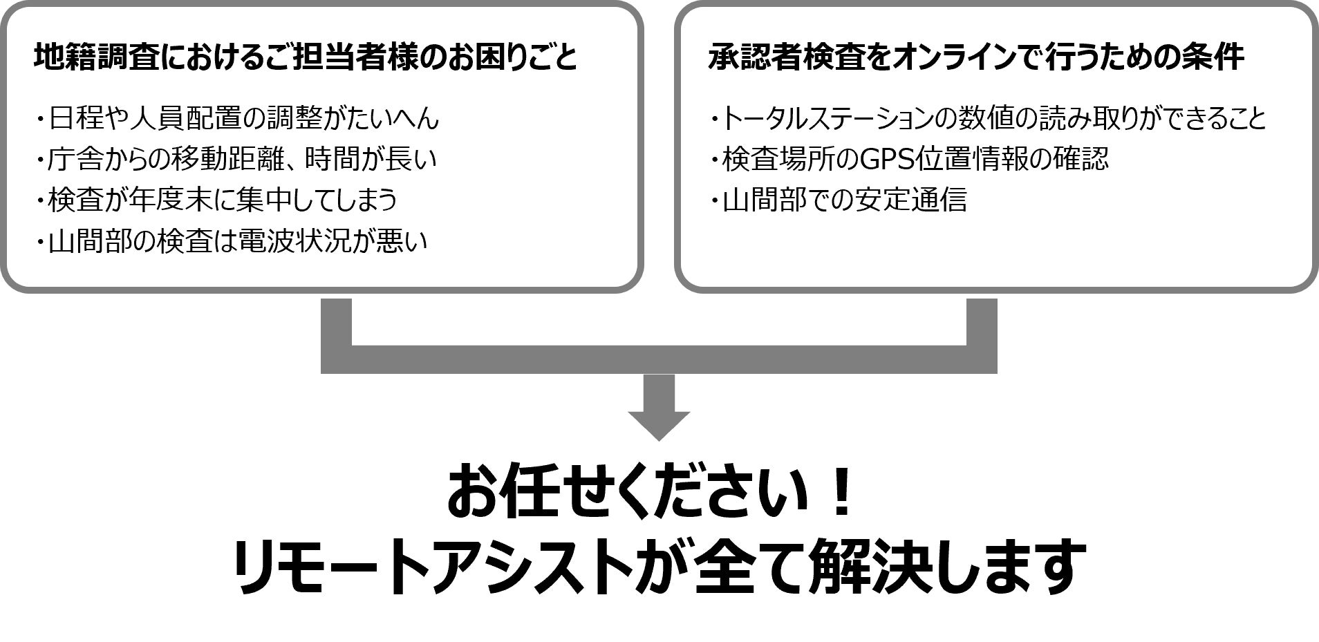 都道府県庁は、辺長検査と呼ばれる一連の工程(筆界点の位置・名称確認、TSによる観測結果の読み取り)等が適切に実施されているかを、現地又はオンライン等で検査するもの(別表1)とされています。リモートアシストは、地籍調査の認証者検査をオンラインで行うための基本的な機能を有しています。