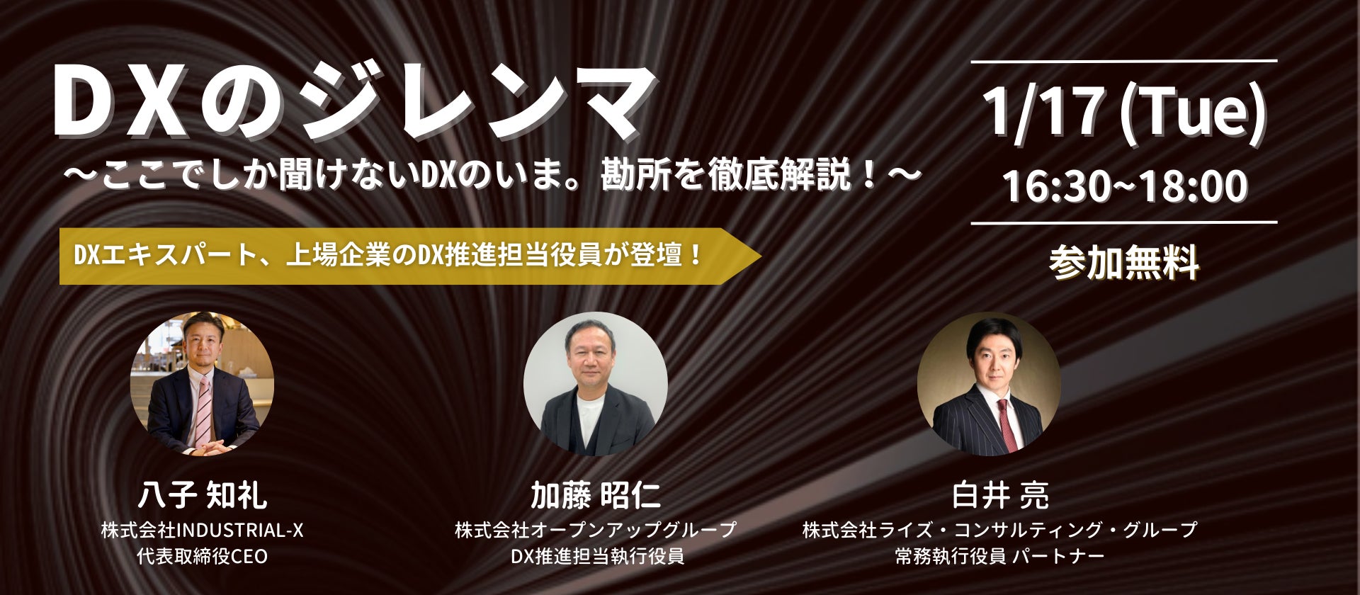 今回のセミナーでは、DXをテーマとして最前線で企業の変革支援を担っている株式会社INDUSTRIAL-X 代表取締役CEO 八子知礼氏と、上場企業で実際にDXの推進リードを担当している株式会社オープンアップグループ DX推進担当執行役員 加藤昭仁氏をお迎えします。「事業・業務変革を実現する上でDXが抱えるジレンマ」をテーマとして、実例のご紹介と、座談会の二本立てで徹底的に深堀していきます。
