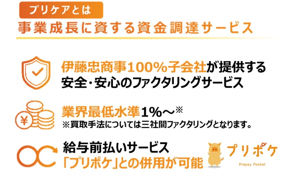 当社では、従前より、給与前払いサービス「プリポケ」をご利用のお客様(特に人材派遣業界のお客様)より、取引先からの支払いサイトに起因する資金繰り懸念から、新規取引の受注に及び腰となり、事業拡大の機会を逃しているというお悩みをお聞きしておりました。今般当社が開発したファクタリングサービス<プリケア>をご利用いただくことにより、取引先の与信を切り離し、また入金を前倒しにすることによって、より多くの業務が受注できるようになります。