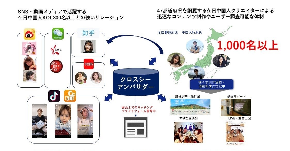 「ヒトとコンテンツの力で世界・アジア各国の経済・文化の交流促進に貢献し、より豊かな社会を創造する。」をミッションに掲げ、中国向けマーケティング事業や越境EC事業を展開。業種業態問わず、中国市場展開の需要を有する法人顧客へワンストップソリューションを提供しております。中国進出のハードルを下げるため、低コストでソーシャル越境ECを開始できるソリューションプラン「One Stop To China」を提案しております。また、独自の在日中国人インフルエンサー(KOL:Key Opinion Leader / KOC:Key Opinion Consumer)ネットワークを活用したインバウンドプロモーションを手掛けております。
