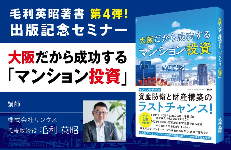 大阪駅前再開発、大阪・関西万博、IRなどの話題が続く大阪市中心部のワンルームマンションに特化した不動産投資で資産形成をサポートする株式会社リンクス(大阪府大阪市、代表取締役 毛利英昭、以下「当社」)は、新刊書籍出版を記念し、東京・新橋、大阪・梅田で不動産投資セミナーを開催します。