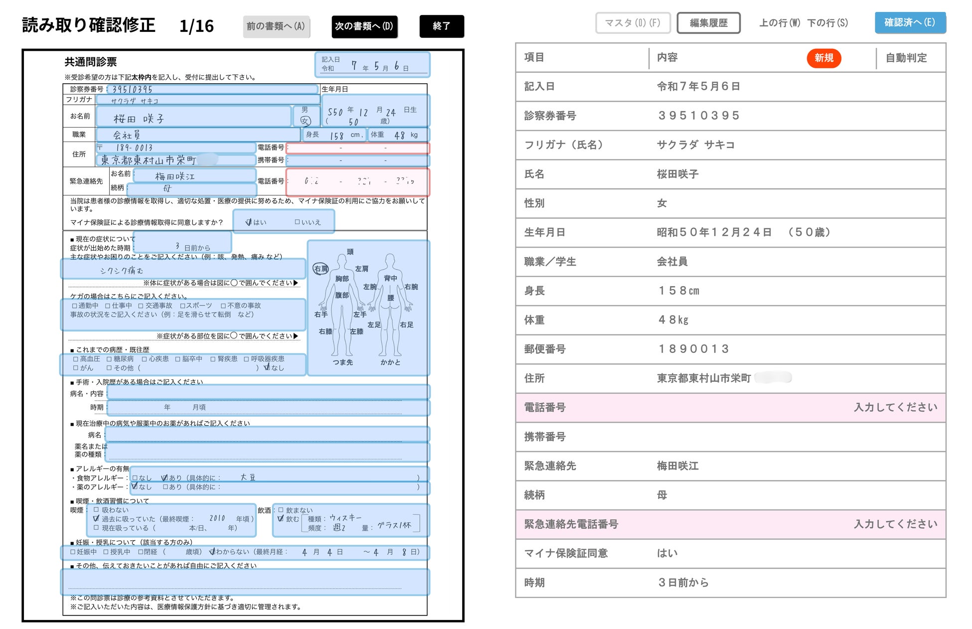 読み取り内容を一覧で確認でき、必要に応じて編集が可能です。