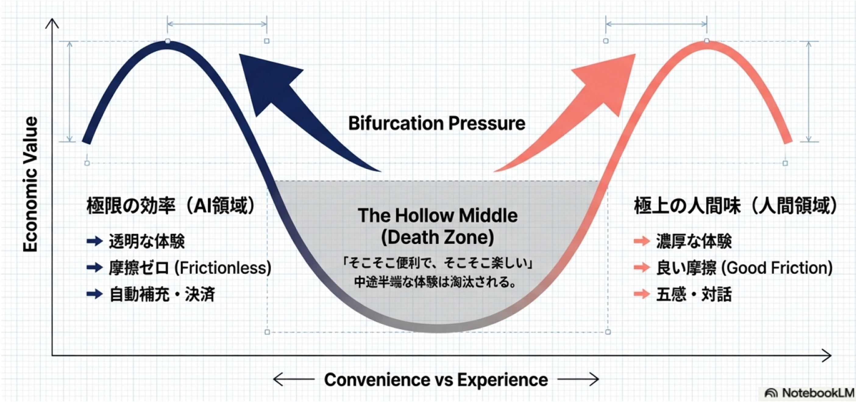 2024年から2025年にかけて生成AIは急速に普及し、日本の生活者においても20代の利用経験は4割を超え、今後、諸外国と同様に高い利用率になることが予想されます。特に2026年は、AIが単なる情報収集の道具から、ユーザーの意図(Intent)を汲み取り、商品の比較・検討、さらには決済までを自律的に代行する「エージェンティック・コマース」への転換点となります。これにより、従来の「検索」という行為が減少し、顧客体験は「極限の効率を求めるAI領域」と、「極上の人間味を求める人間領域」に二極化していくことが予測され、企業はその両極への対応を迫られています。
