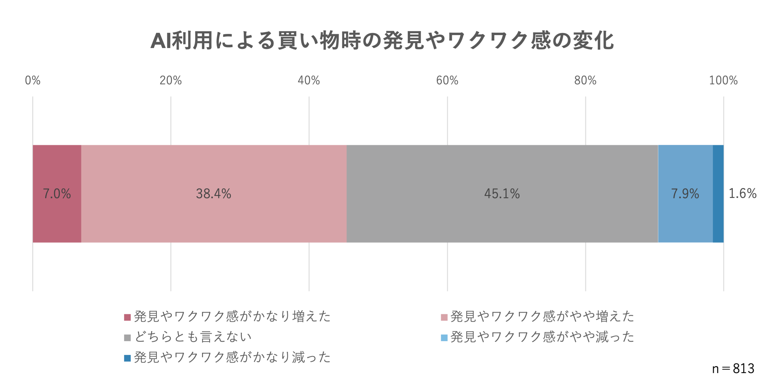AIを利用した買い物での発見やワクワク感の変化では、45.4%が「発見やワクワク感が増えた」と回答。(生成AIネイティブユーザーベース n=813)