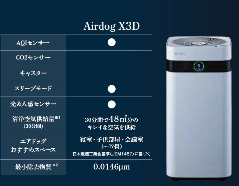 ※1 X5D:キレイな空気とは、試験対象物質(タバコ煙粒子)を含まない清浄空気のことであり、清浄空気供給量はChina GB/T18801‐2015 Air Cleane規格により外部機関(Vkan Certification & Testing Co.,Ltd.)で試験して得られたCADR値に基づいた数値より算出した清浄空気の供給量を示す。AHAM規格に基づく数値ではありません。X3D:キレイな空気とは、試験対象物質(タバコ煙粒子)を含まない清浄空気のことであり、清浄空気供給量は、AHAM規格により外部機関(PSB Singapore)で試験して得られたCADR値に基づいた数値より算出した清浄空気の供給量を示す。いずれも部屋の高さを2.4m として算出