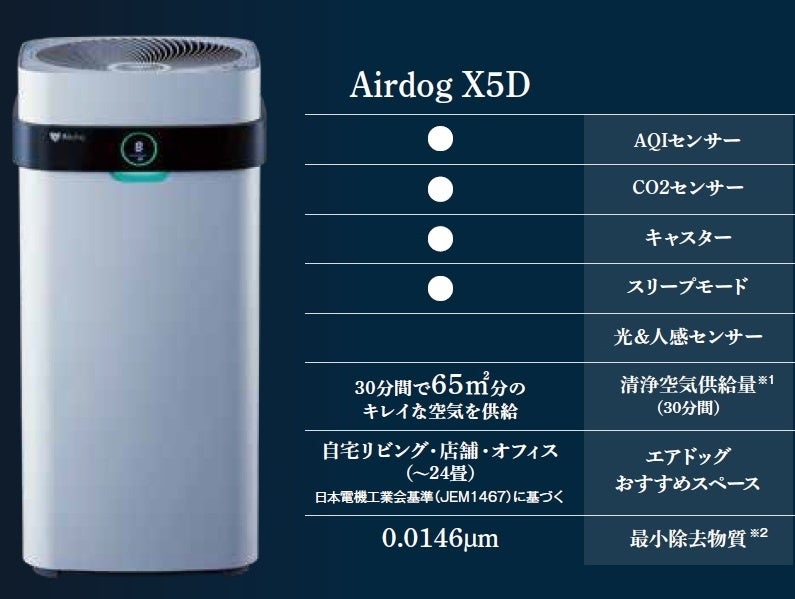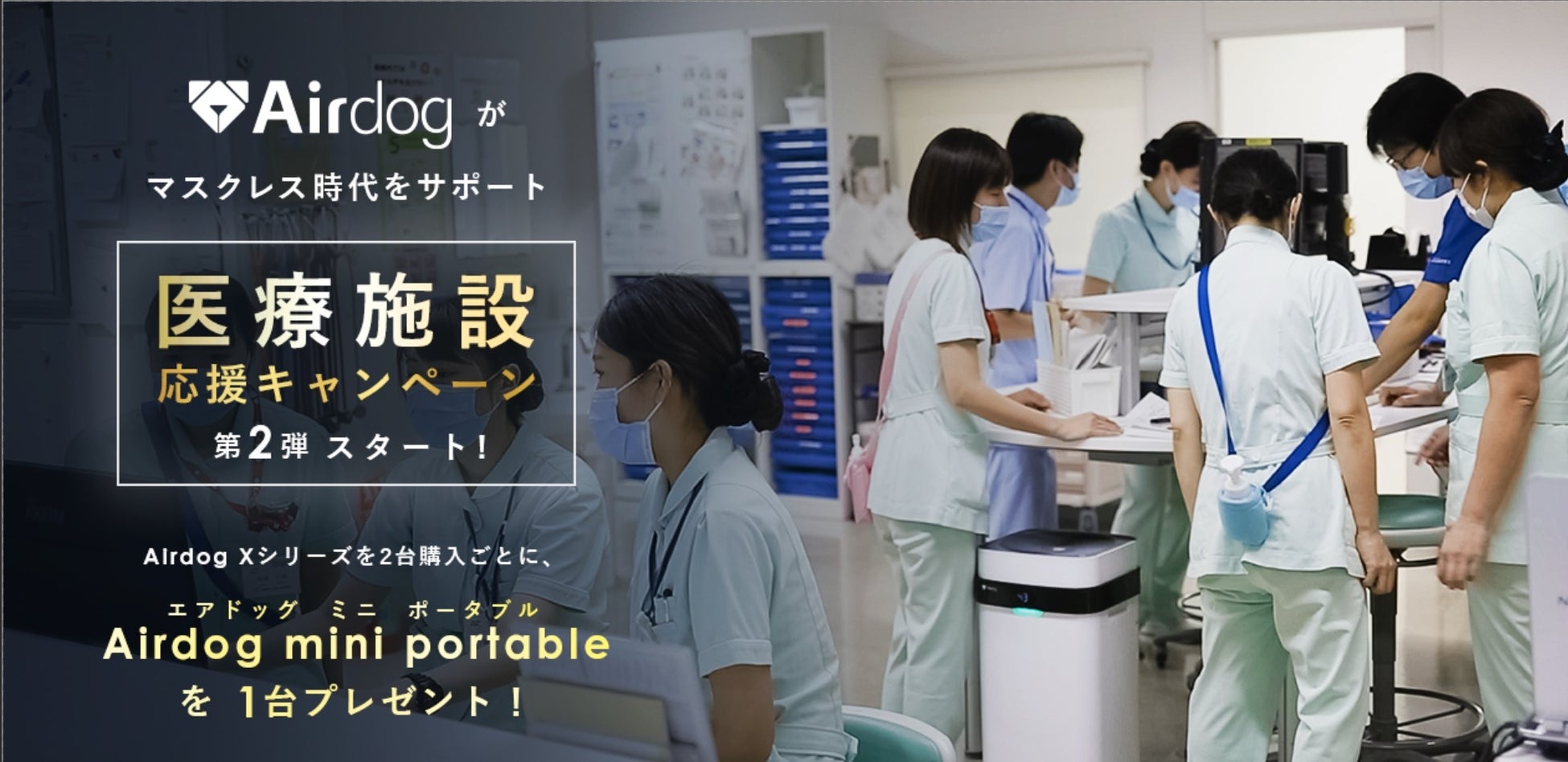 浮遊ウイルスを99.9%除去※2可能な高性能空気清浄機 「Airdog(エアドッグ)」は、発売以来多くの方々にご愛用頂いております。その中でも全国10,000か所以上の医療施設で導入されており、来院される方々や働くスタッフの皆さまの日々の環境改善に活用頂いております。今後マスクレスへと変わりゆく環境で、不安を感じる方もいらっしゃる中、医療従事者および多くの方々により安心して施設をご利用頂けるよう、思いを込めて下記キャンペーンを実施いたします。