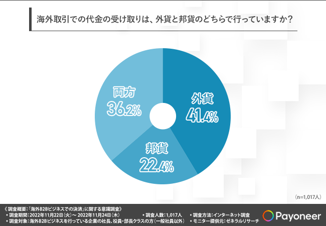 「海外取引での代金の受け取りは、外貨と邦貨のどちらで行っていますか?」と質問したところ、『外貨(41.1%)』『邦貨(22.4%)』『両方(36.2%)』という結果になりました。