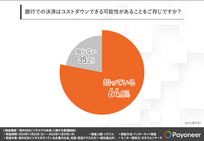 「銀行での決済はコストダウンできる可能性があることをご存じですか?」と質問したところ、『知っている(64.8%)』『知らない(35.2%)』という結果になりました。
