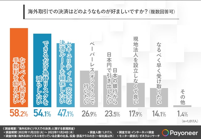 「海外取引での決済はどのようなものが好ましいですか?(複数回答可)」と質問したところ、『なるべく手続きや手数料を抑えたい(58.2%)』と回答した方が最も多く、次いで『できるだけ為替リスクを減らしたい(54.1%)』『セキュリティ上、安全な決済ルートを確保したい(47.1%)』と続きました。