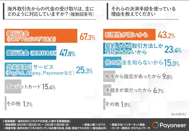 銀行送金(SWIFTなどのT/T送金)を利用している企業が最も多く、約7割に上りました。