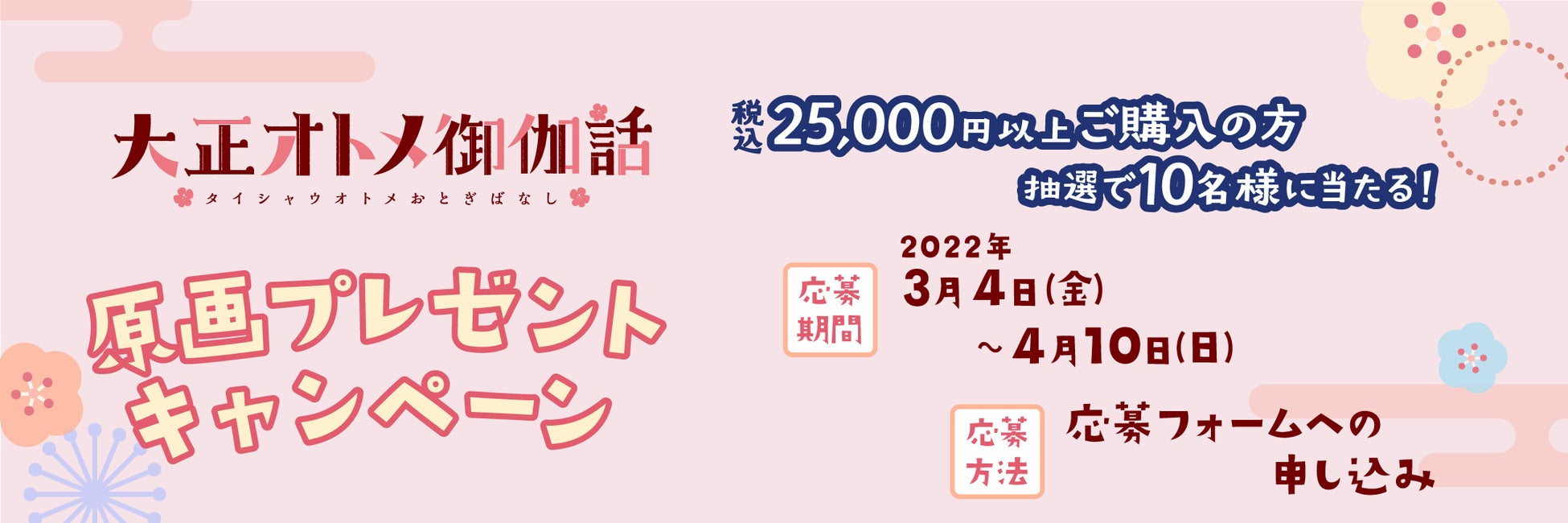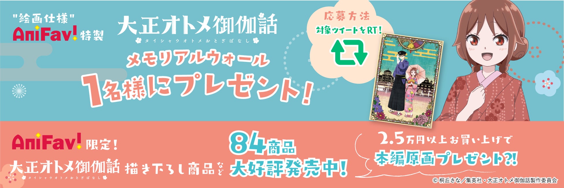 さらに、AniFavで「大正オトメ御伽話」の商品を25,000円以上お買い上げの方に抽選で10名様にアニメ制作スタッフより原画をプレゼントする豪華キャペーンを実施しております。
