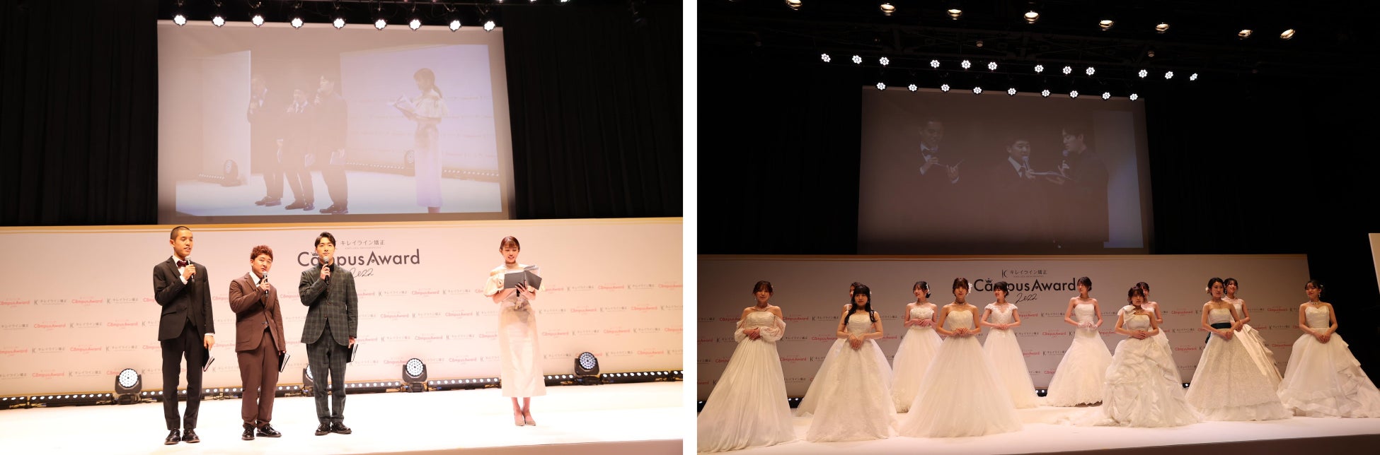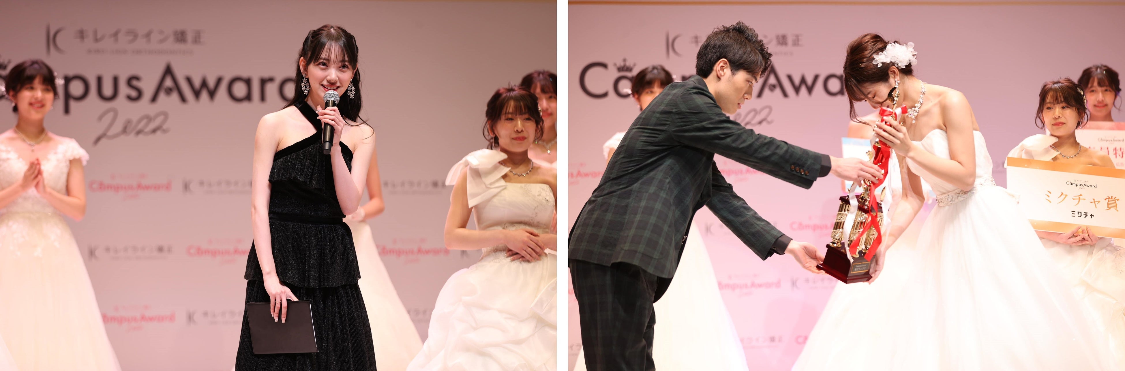 表彰式のクライマックスでは、応援アンバサダーの堀未央奈さんのプレゼンターのもと、「キレイライン CampusAward 2022」【グランプリ】に藤井 珠生さんが選ばれ、ガウンとティアラ、トロフィーを授与されました。藤井さんは「キャンパスフェスから約8か月、応援してくださったファンの皆さん、友達のみんな、家族、本当にありがとうございました。なにも挑戦することができなかった私が、ミスコンからキャンパスアワードに出場し、まさかグランプリをとれるなんて。本当に素敵な経験をさせていただきました。私がここまでくることができたのは、皆さんと二人三脚で歩んで来れたからです。アナウンサーという夢に向かって最後まで走り切ろうと思います。本当にありがとうございました。」と受賞後の喜びと感謝の気持ちを涙ながらに語りました。グランプリには、賞金200万円、「GirlsAward」ランウェイ出演権、メインスポンサー「キレイライン矯正」での治療体験、雑誌「Ray」への掲載権、CampusAward 2023の広告モデル起用など豪華副賞が贈られました。