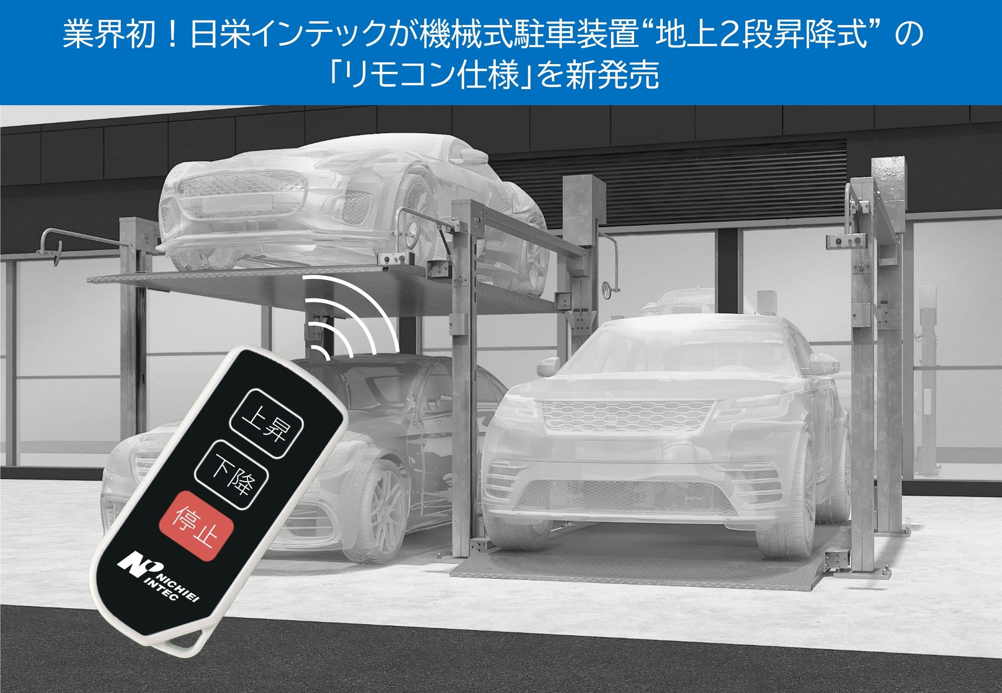 日栄インテック株式会社(本社:東京都荒川区、代表取締役:西川 嘉俊、以下 日栄インテック)は、機械式駐車装置“垂直昇降式”のトップメーカーとして、限られたスペースで駐車台数を増やすことができる装置を、幅広く提供しています。このたび新たに「地上2段昇降式」のオプションとして、業界初となる“リモコン”で操作できる装置の販売を開始しましたことをお知らせいたします。