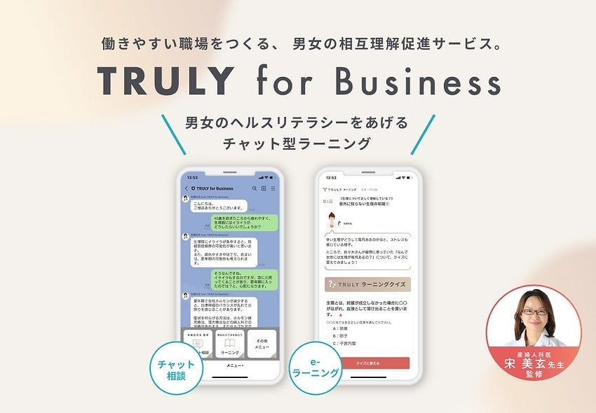 法人向けサービスである「TRULY for Business」は、女性医師監修のチャット型ラーニングと、医師・専門家にラインで手軽につながれるチャット相談のパッケージ。ホルモンによる心身の不調についてのリテラシー向上と、いつでも相談できる心の寄りどころとして、心と体の両方から働く人をサポートします。
