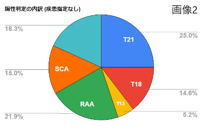 18トリソミーの陽性結果が出た受検者様は120人になり全受験者様の約0.41%です。画像2を見てわかるように全陽性判定者の14.62%がエドワーズ症候群(18トリソミー)の判定が出た事が分かりました。