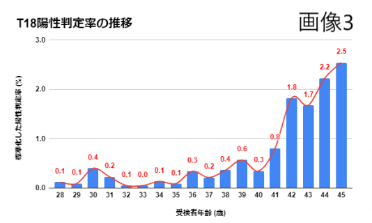 35歳未満の受検者では0.15%の割合で陽性判定が出ています。しかし、35歳以上になると4倍以上の0.60%の割合で陽性判定が出ています。母体の年齢が高くなればなるほど、産まれてくる赤ちゃんに染色体異常が見られる確率が高くなります。