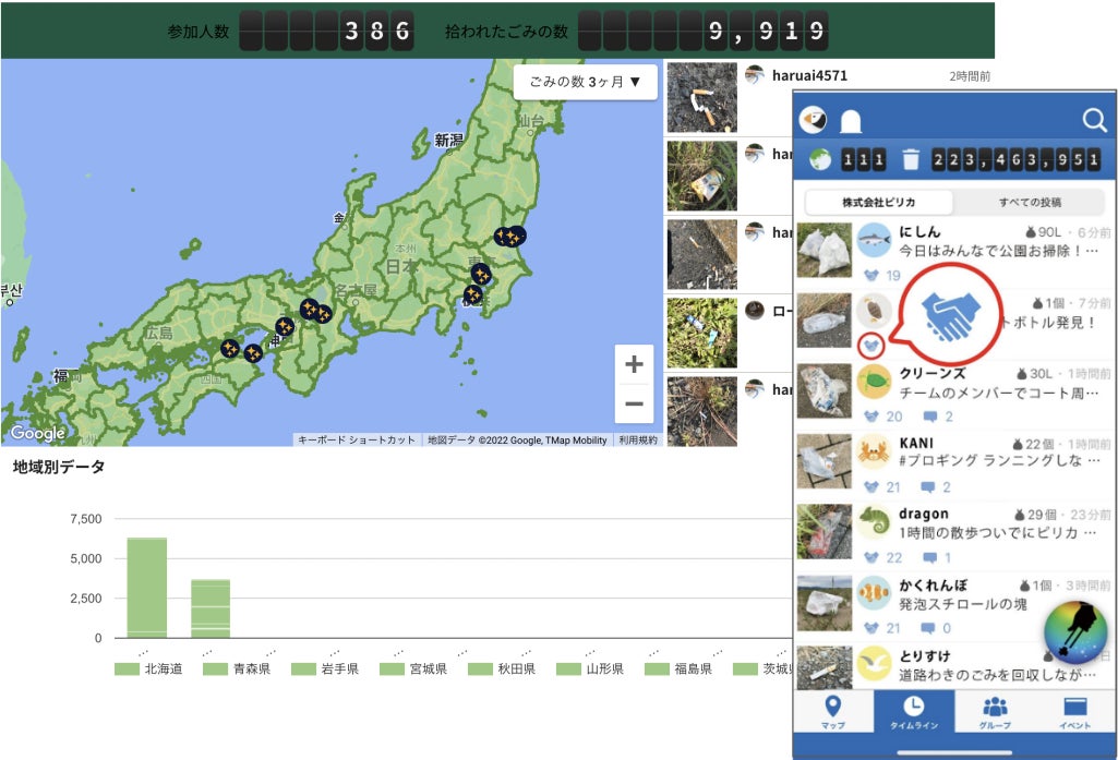 環境美化活動で回収したごみをアプリに登録し、全国規模のデータ集計を行います。