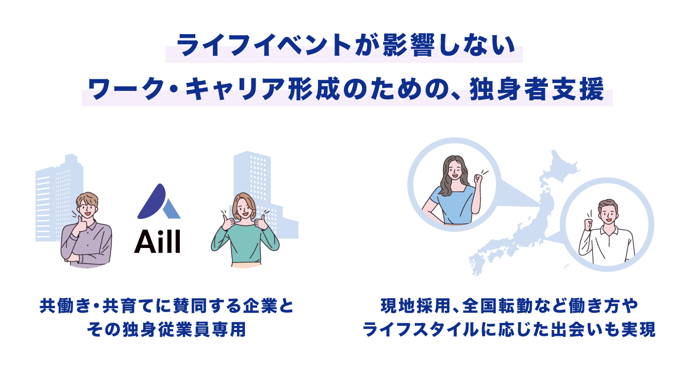 Aill goenは、仕事も家庭も支え合うことに賛同する企業とその企業に所属する独身従業員専用サービスです。