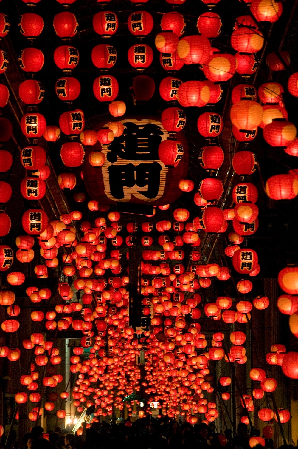 室町時代に守護大名大内盛見が先祖の冥福を祈るため、お盆の夜に笹竹の高灯籠に火を灯したのが始まりと伝えられ、約600年続く伝統のお祭り。竹につけた数万個の紅ちょうちんが幻想的な光を放ち、商店街は、ちょうちんのトンネルで美しく彩られます。現在も、実際にろうそくに火を灯して飾られています。
