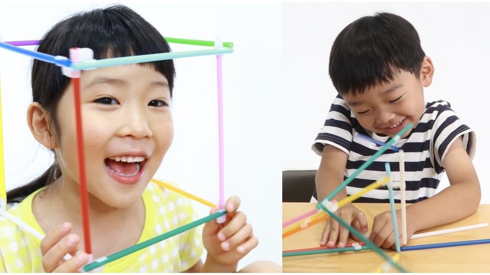 ②建物を「建築」してみましょう。今度は屋根づくりなどのために、クランプを斜めにしてうまく組み立てるための「空間把握力」などが必要になります。とはいえ、ただ手を動かしているだけで完成してしまうのがアシボの優れたところ。ストローの長さと角度の関係が自然と分かり、立体図形の考え方に強くなっていきます。