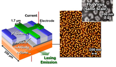量子ドットレーザとは、直径約10nm(ウイルスの1/10程度のサイズ)の半導体量子ドットを活性層に用いて、光を増幅、発振する半導体レーザです(図1)。この量子ドットレーザは、1)摂氏マイナス40度から120度近辺まで電流無調整で動作する、2)200度以上の超高温でも動作する、3)高信頼で長寿命である、4)シリコンフォトニクスチップに低雑音でレーザ光を導入できる、という優れた特徴を持っています。