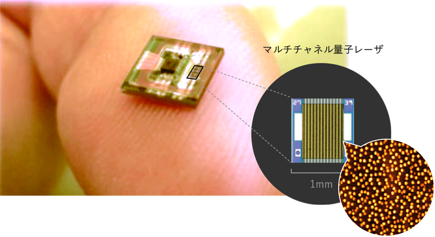 当社は、かつて「実現は不可能」と言われた光通信用量子ドットレーザ(=Quantum Dot Laser)
