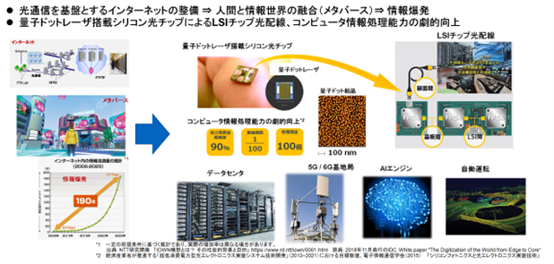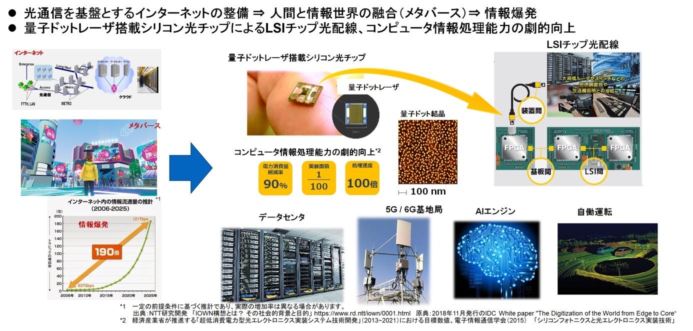 QDレーザは、シリコンフォトニクス光配線に不可欠な量子ドットレーザの開発と量産によって、コンピュータの情報処理能力の飛躍的向上によりこの課題の解決に貢献し、ひいては人間と情報世界の融合する時代の一翼を担うことを目指します。