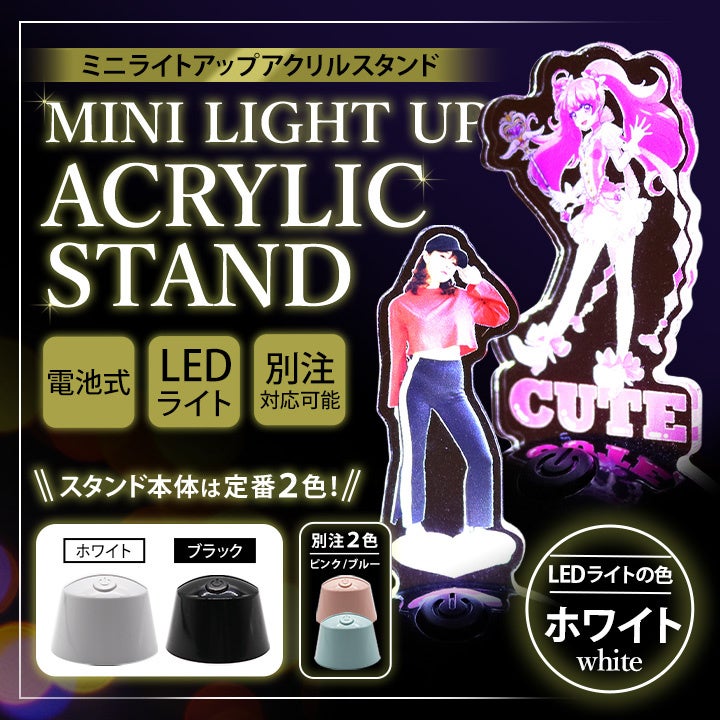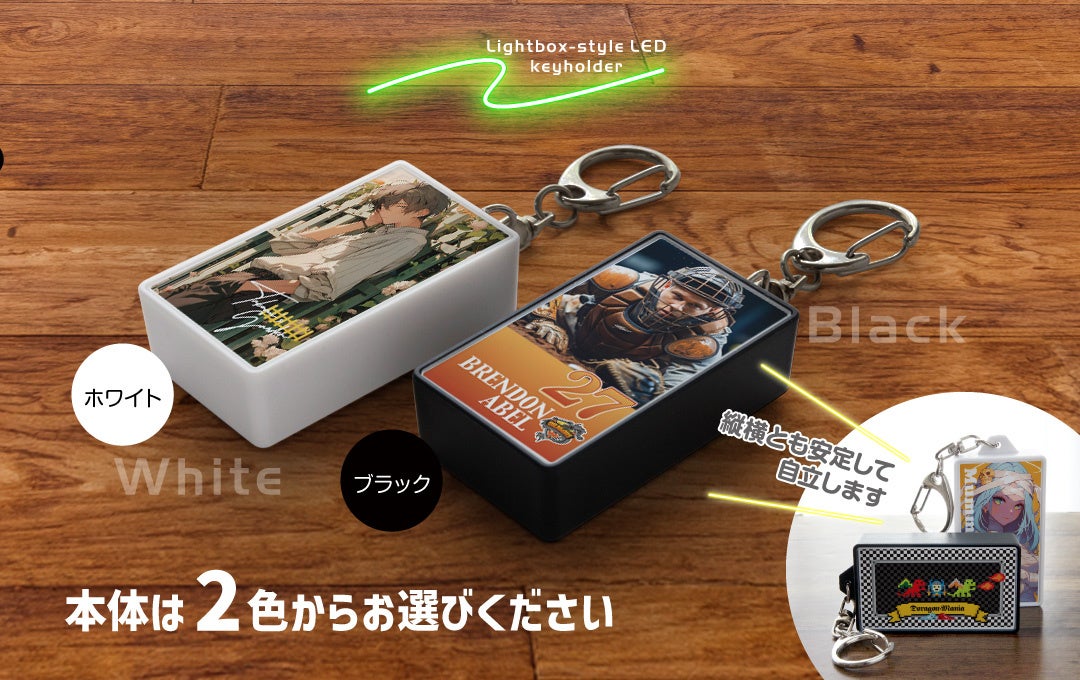 ホワイトは、暗めのデザインやロゴを引き立て、清潔感や光の印象を強調したい「光るキーホルダー」としておすすめのカラーです。一方、ブラックは重厚感があり、キャラクターのイラストや肖像の色味をぐっと際立たせ、LEDライトキーホルダーとしての演出効果も高まるカラーとなります。