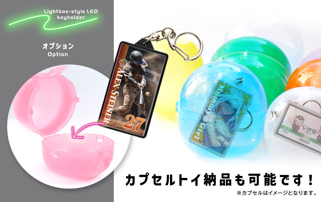 コンパクトで軽量、さらにLEDによる発光機能を備えた本アイテムは、ガチャの景品としても非常に映える仕様。コンサート会場やコミケなどのイベントスペースに設置されたガチャマシンでのグッズ販売はもちろん、観光地でのご当地グッズとしても高い販促効果が期待できます。