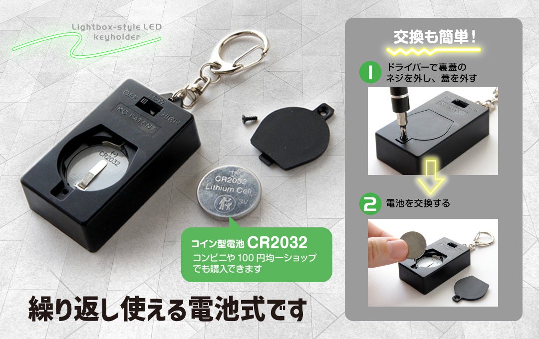 コンビニや100円ショップでも手軽に入手できるコイン型電池「CR2032」を1個使用しています。繰り返し使用できるのでユーザーの満足度も高く、プロモーション効果の長期継続も期待できます。