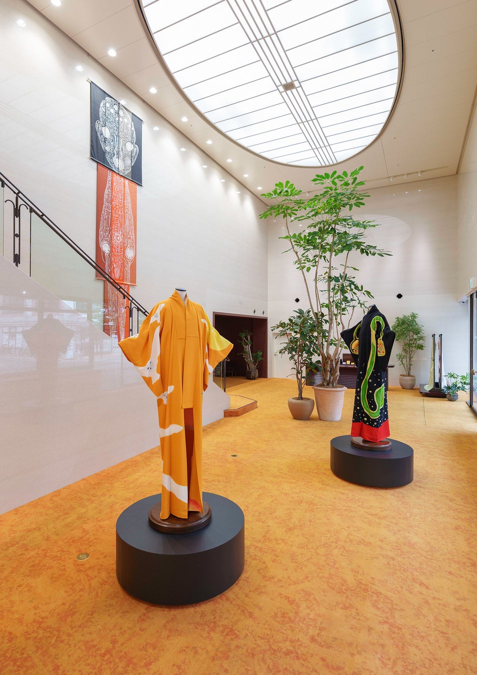 展⽰は加藤によるスケッチをもとに、着物の形をとった作品など20点以上で構成されています。制作にあたり、⽷⽬友禅や描き友禅、絞り染め、刺繍、仕⽴てまで、20から30にもおよぶ伝統的な⼯程は千總本社内にある⼯房のほか、京都府内にあるそれぞれの専⾨⼯房で⾏われました。加藤⾃⾝、何度も京都を訪れ、特に「⼈型(ひとがた)」と称される彼特有のモチーフは、⾃ら筆をとり、職⼈たちと肩を並べながら伝統的な友禅の技法によって描きました。⻑年にわたる千總の歴史の中でも、友禅職⼈以外の⼿によって着物⽣地に染⾊が加えられるのは極めて珍しいことです。