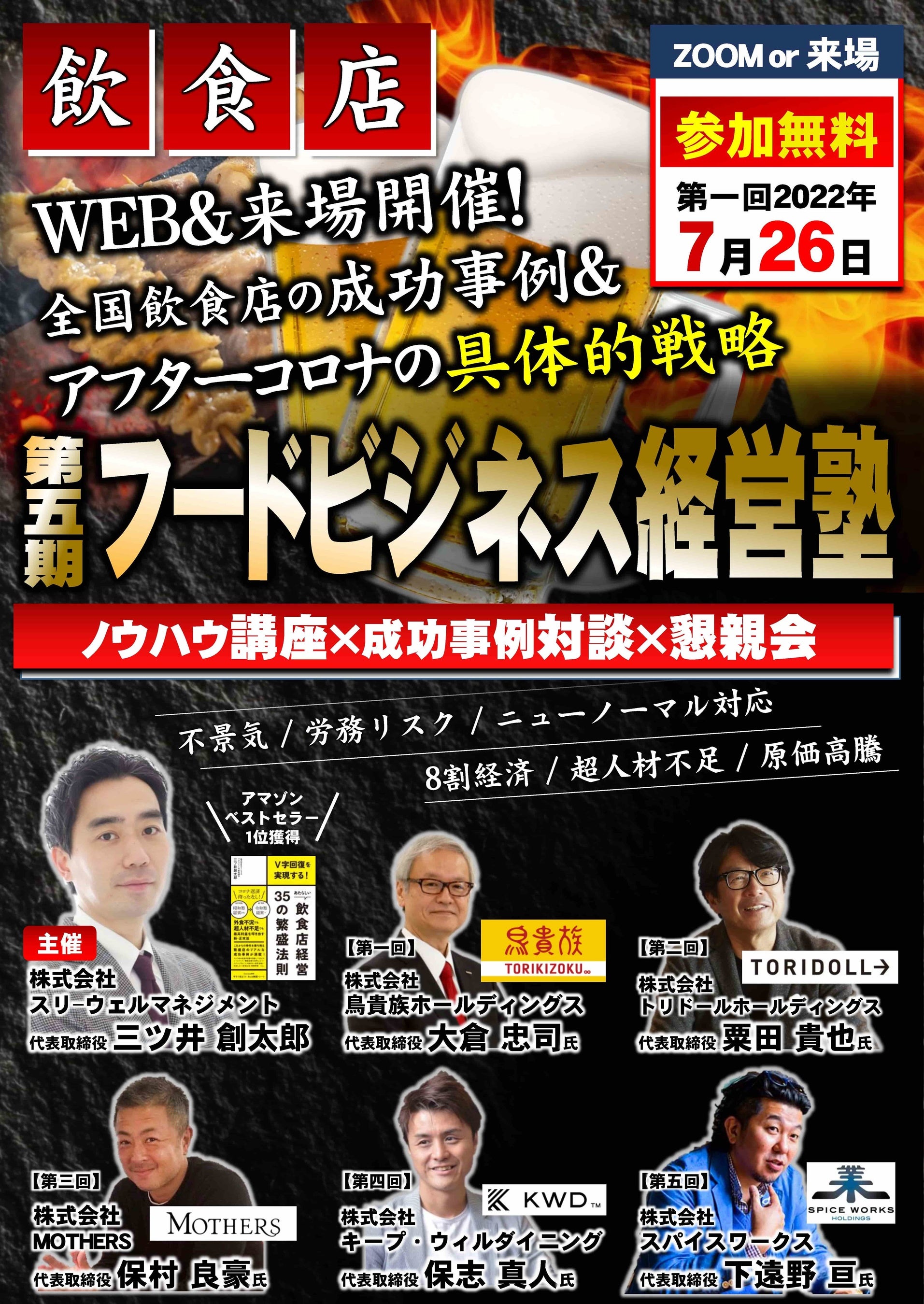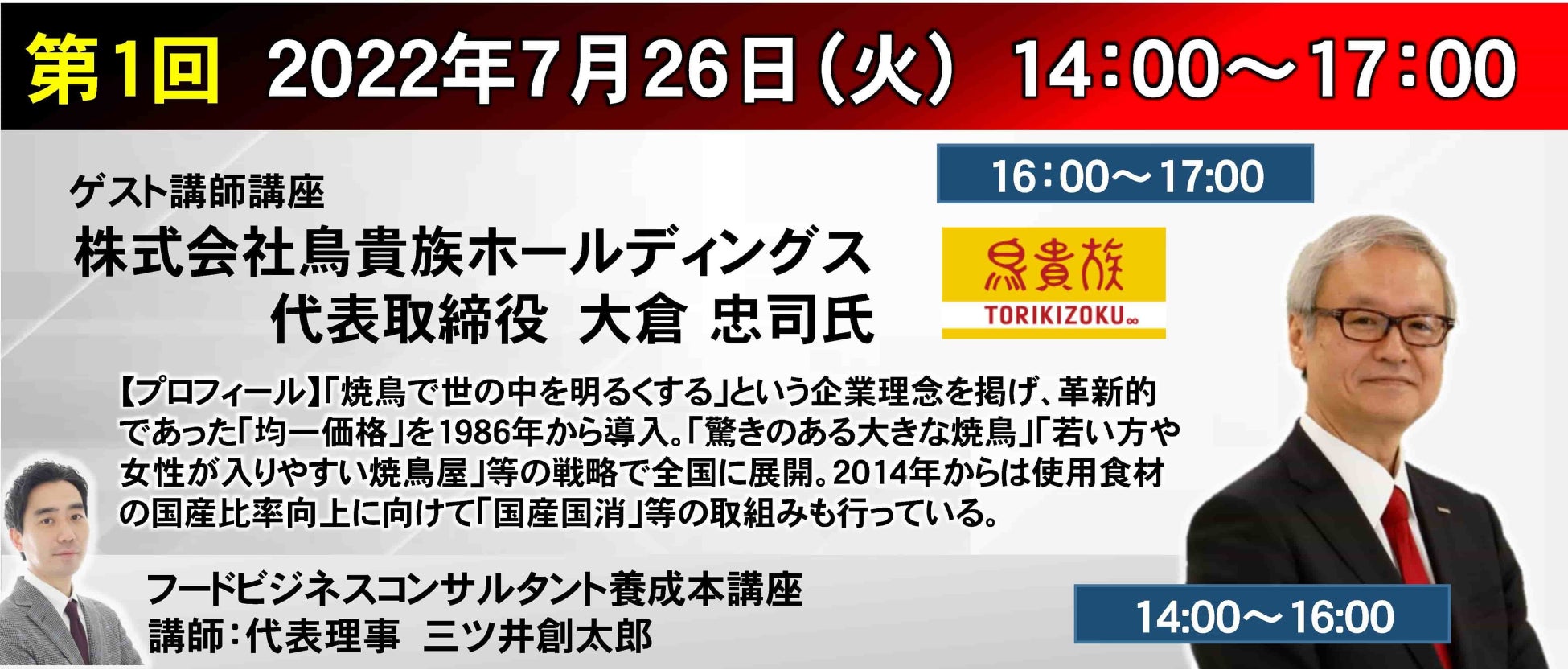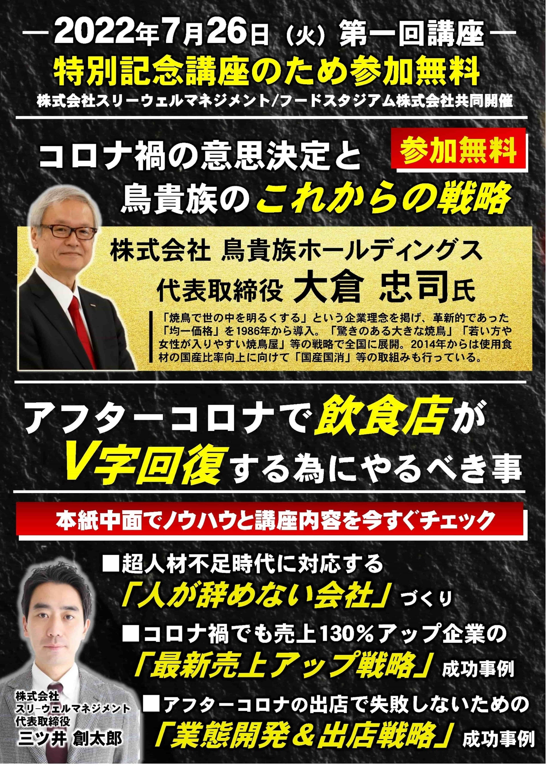 この度、鳥貴族ホールディングス大倉忠司社長をお招きした無料セミナー(WEB又は来場)を7月26日に開催させて頂きます。当日は弊社代表の三ツ井と大倉社長の対談を始め、アフターコロナでV字回復を実現する為の具体的な戦略と成功事例などを分かりやすくお伝えさせて頂きます。