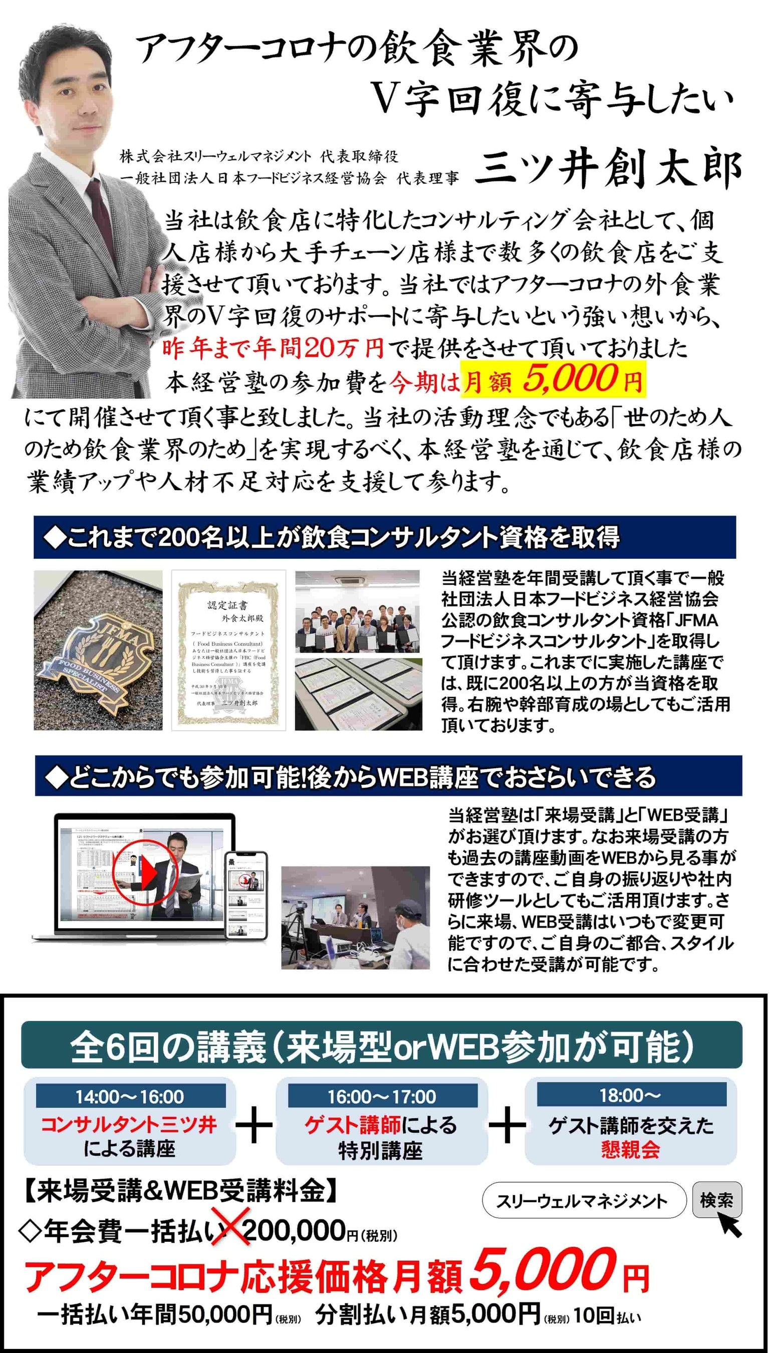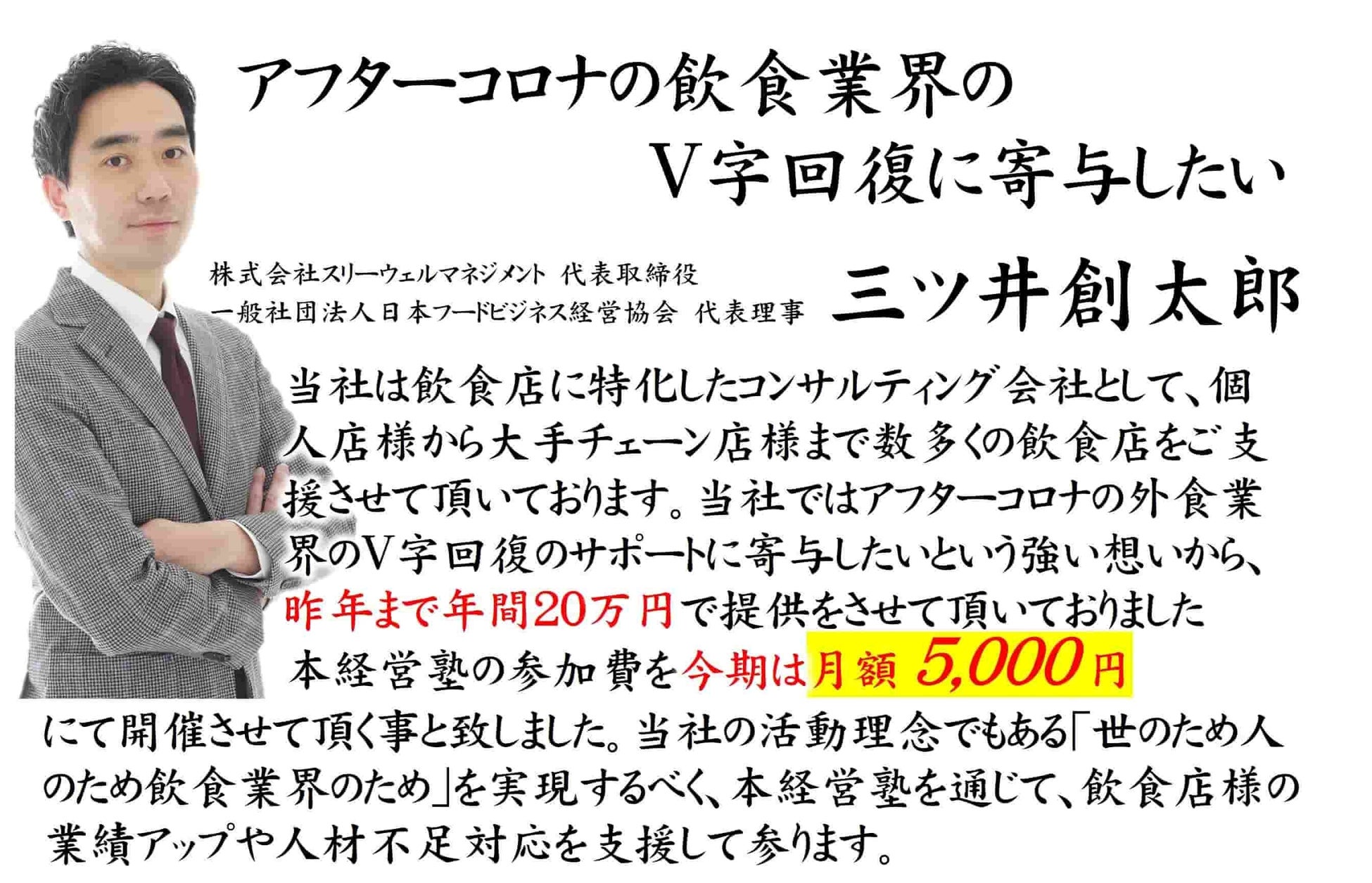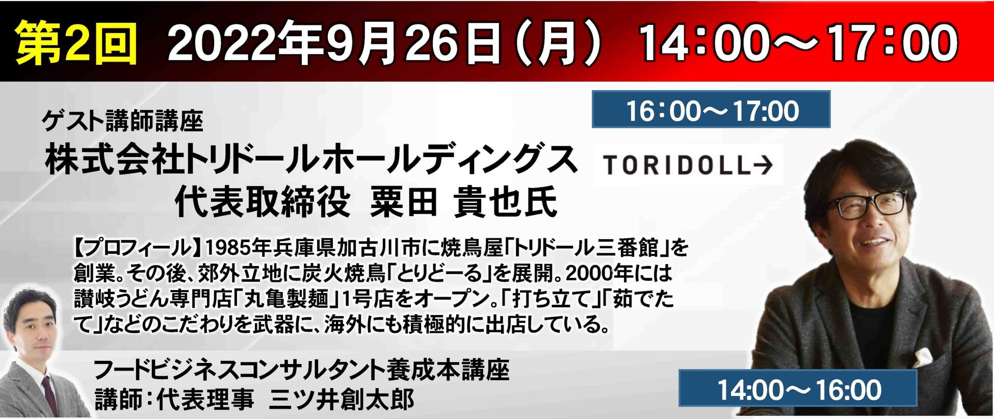 この度、鳥貴族ホールディングス大倉忠司社長をお招きした無料セミナー(WEB又は来場)を7月26日に開催させて頂きます。当日は弊社代表の三ツ井と大倉社長の対談を始め、アフターコロナでV字回復を実現する為の具体的な戦略と成功事例などを分かりやすくお伝えさせて頂きます。