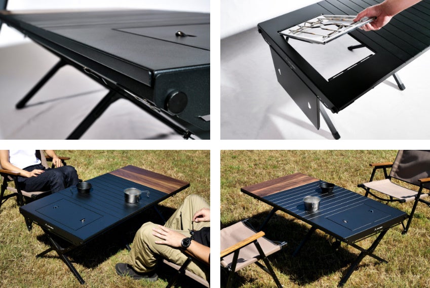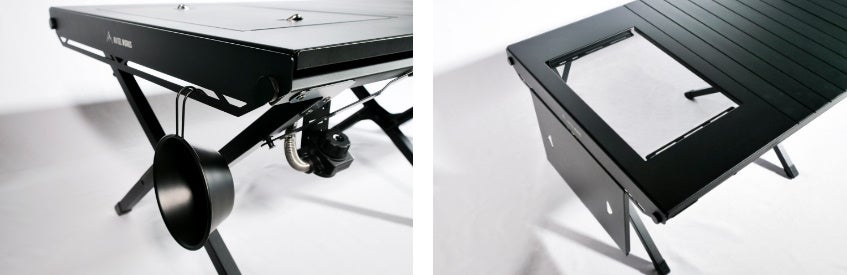 テーブル側面(サイドフレーム)にはスリットが付いており、シェラカップを掛けたり、S字フックを使用してスキレットや、グローブ、トングなどあらゆるものを掛けておくことができます。また、天板の蓋を使用しないときには、スリットに引っ掛けておくこともできます。