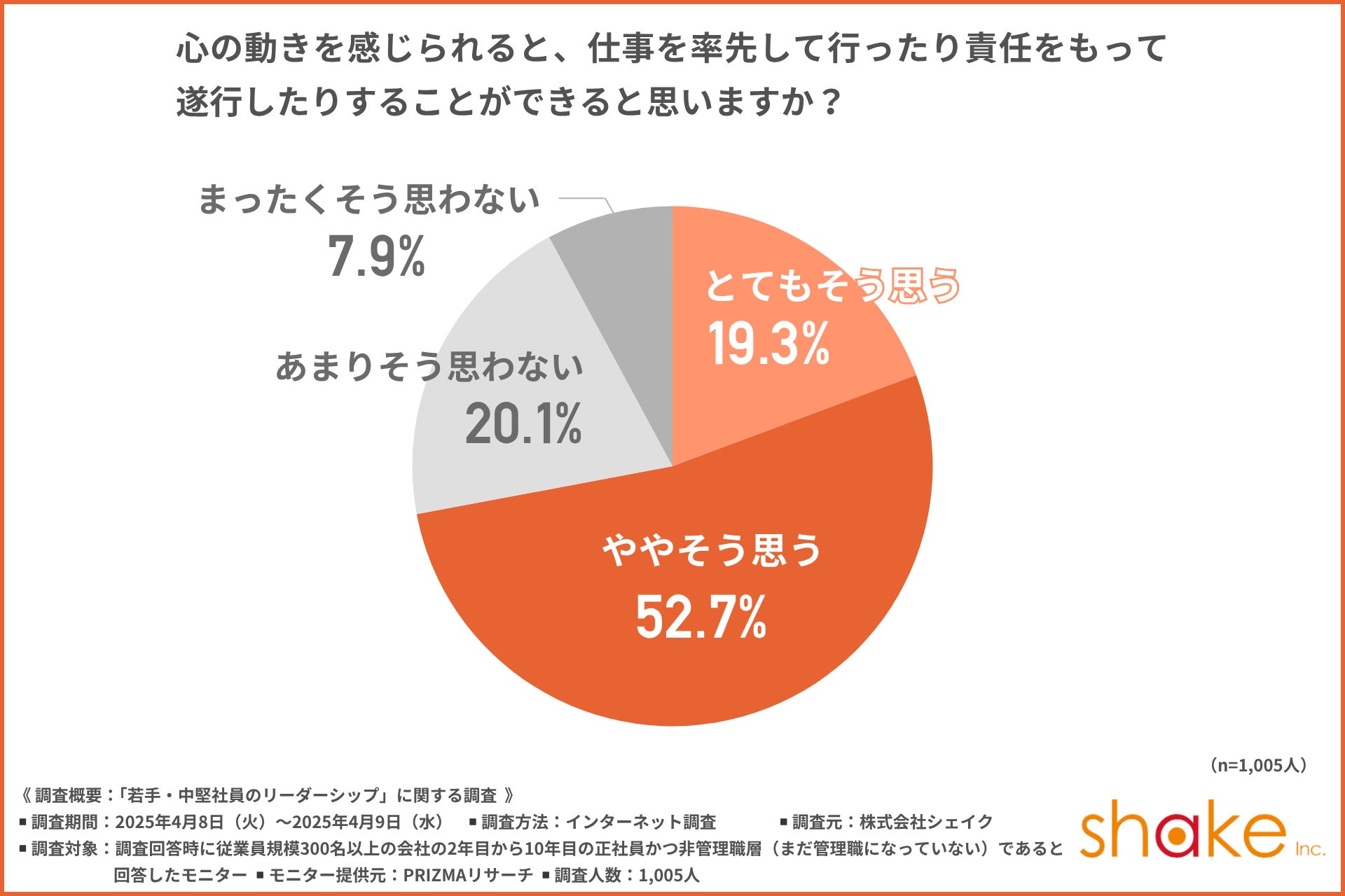 次に「心の動きを感じられると、仕事を率先して行ったり責任をもって遂行したりすることができると思うか」と尋ねたところ、約7割の方が『とてもそう思う(19.3%)』『ややそう思う(52.7%)』と回答しました。