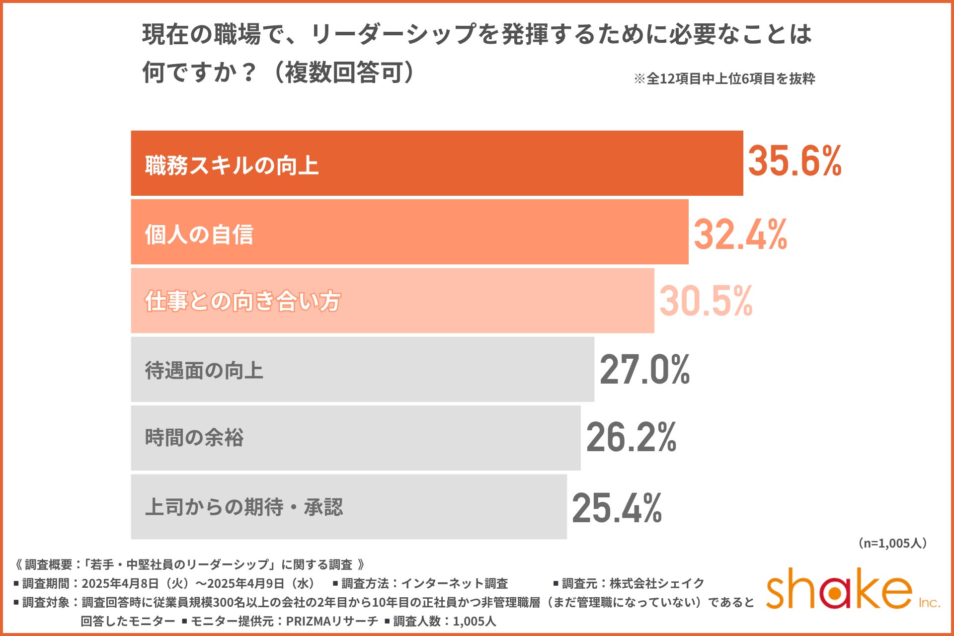 「現在の職場で、リーダーシップを発揮するために必要なこと」について尋ねたところ、『職務スキルの向上(35.6%)』『個人の自信(32.4%)』『仕事との向き合い方(30.5%)』が上位になりました。