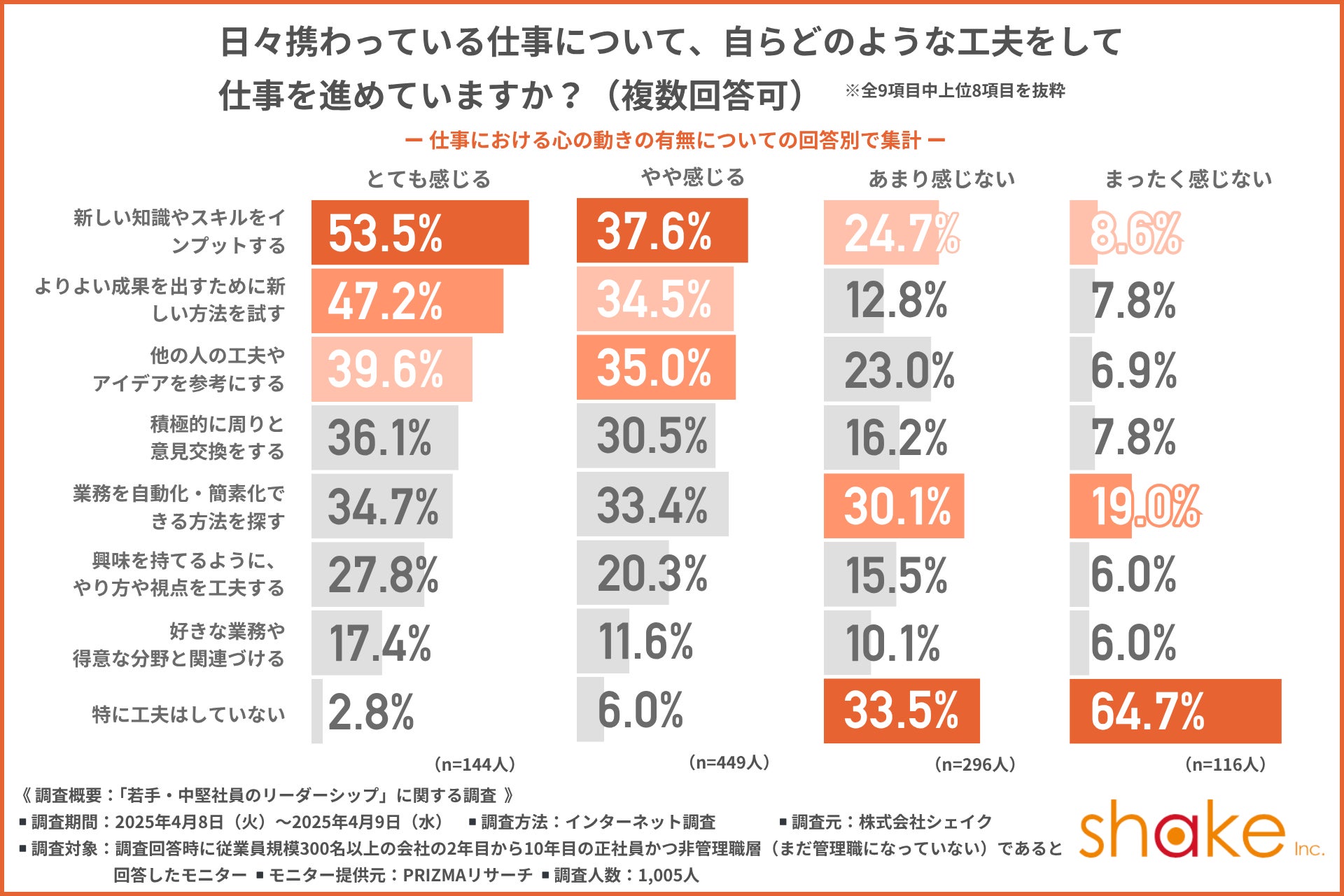次に、「日々携わっている仕事における自主的な工夫」について尋ねたところ、仕事における心の動きの有無によって以下のような回答結果になりました。